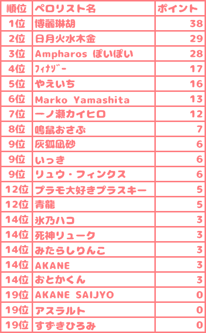 一位の方が35ポイント以上になりましたので、第2回あむたまランキングが終了しました!
